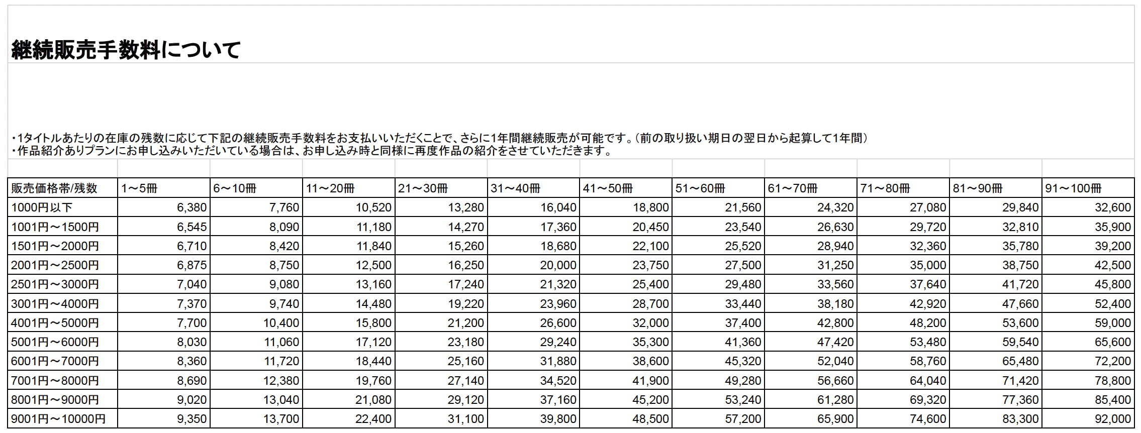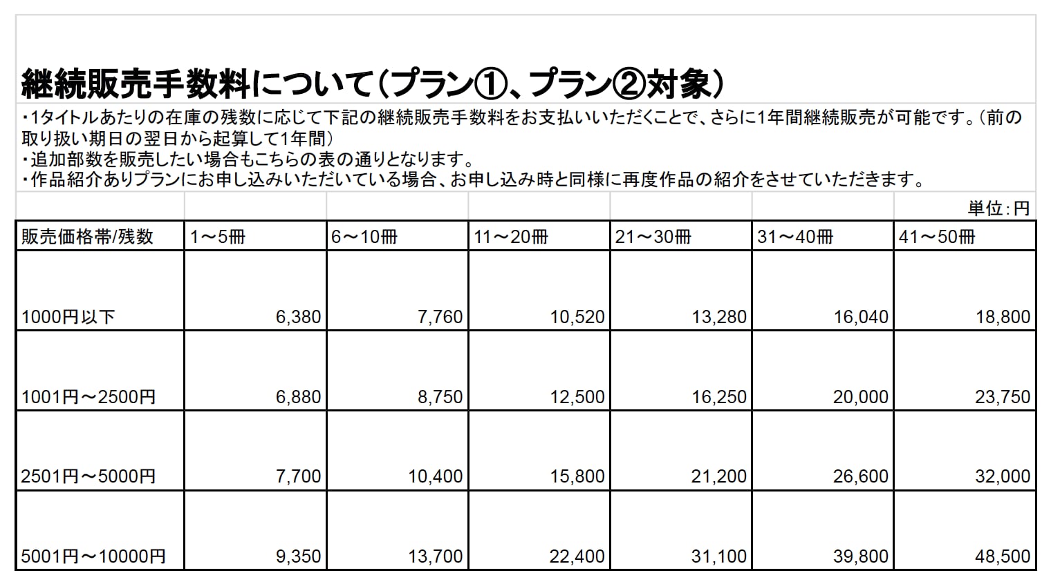 ・継続販売手数料(作品の維持のための費用)を支払い、販売を継続。継続販売手数料は下記の料金表によるものとします。