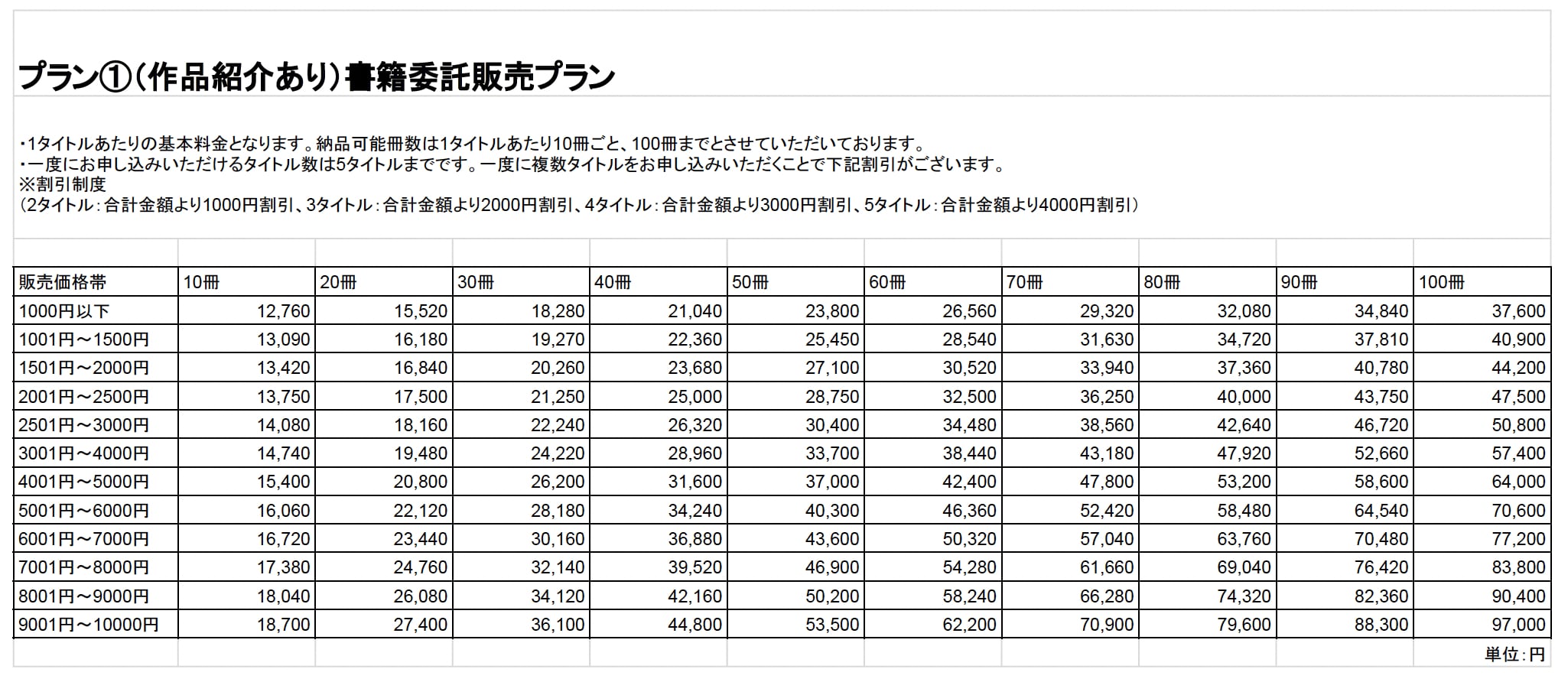 プラン①: (作品紹介あり) 書籍販売委託プラン・割引詳細